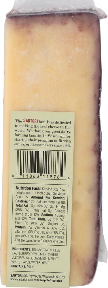 This Wisconsin BellaVitano cheese is soaked in Merlot wine to give the cheese notes of berry and plum. The combination of Wisconsin Cheddar cheese and Parmesan give this BellaVitano cheese a terrific texture, somewhere between creamy and rich and crunchy and granular. This BellaVitano cheese has a slight crunchy feel from calcium crystals (Calcium Lactate), which appear naturally as a part of the aging process. The unique BellaVitano cheese is created by the master cheesemakers at Sartori in Plymouth, Wisconsin, who use time-honored techniques and the highest quality milk.