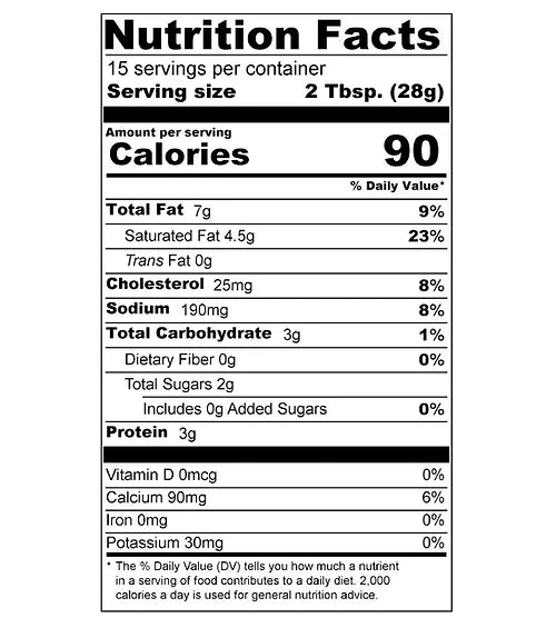 Cream cheese (pasteurized milk and cream, cheese culture, salt, guar gum, carob bean gum, xanthan gum), cheddar cheese (pasteurized cultured milk, salt, enzymes), water, reduced lactose whey, whey, sea salt, sorbic acid (preservative), bell peppers, carrots, onion, lactic acid, tomato, garlic, cabbage, celery, spinach, guar gum, dill, parsley.
